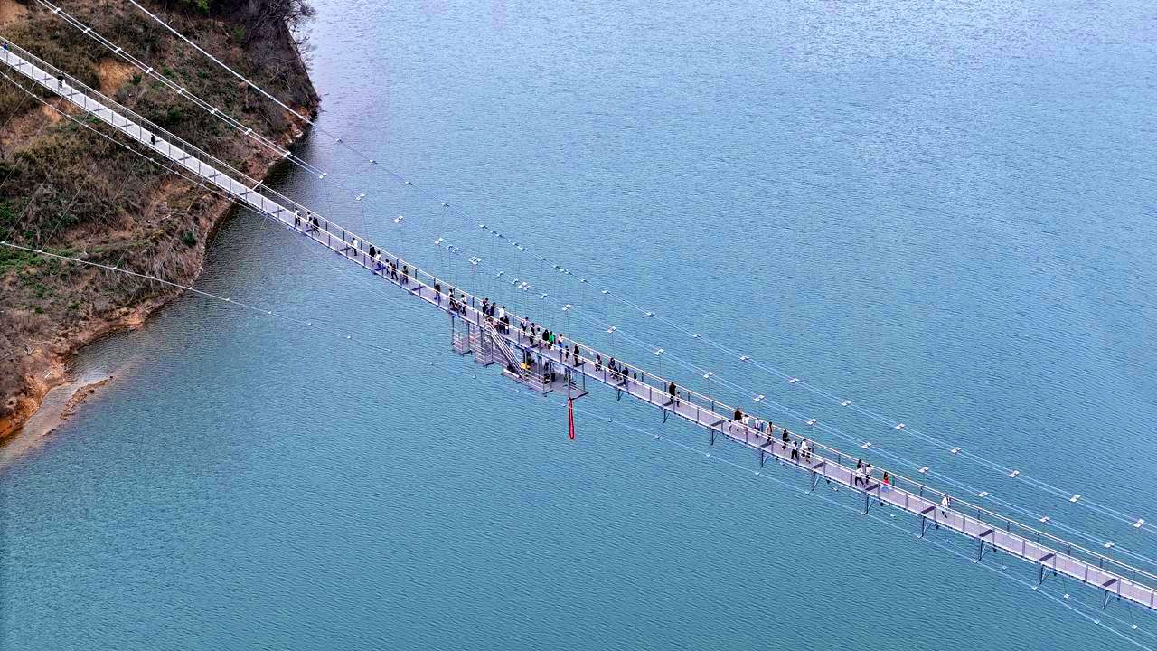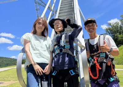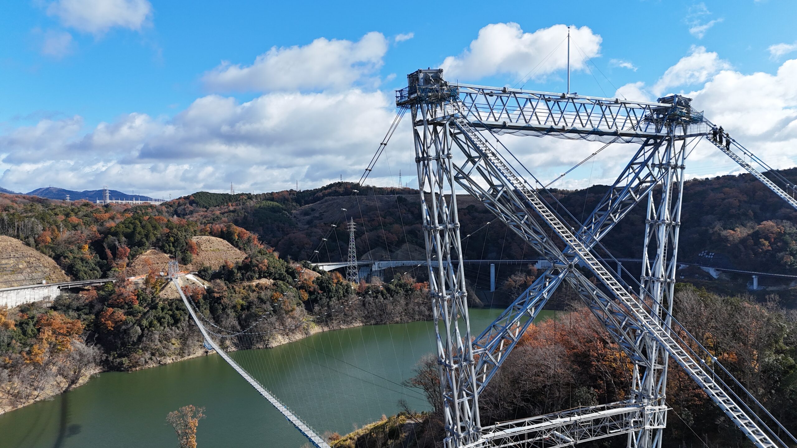 幅1.5mの歩行用吊り橋では日本最長。世界でも3番目の長さを誇ります。車いすの方でも渡ることができます。