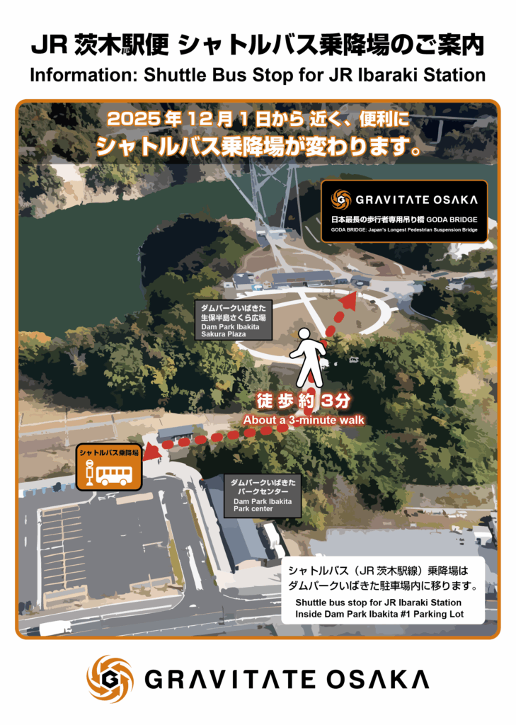 2025年12月1日より、JR茨木駅発着のシャトルバスにつきまして、ダムパーク側の乗降場の位置を変更することとなりました。